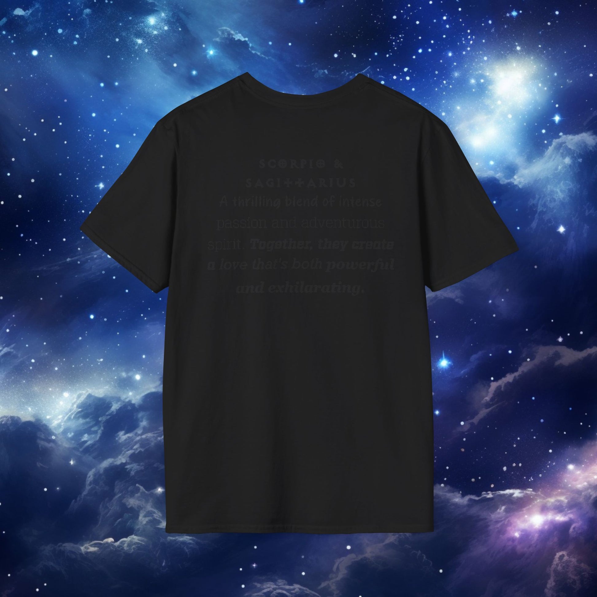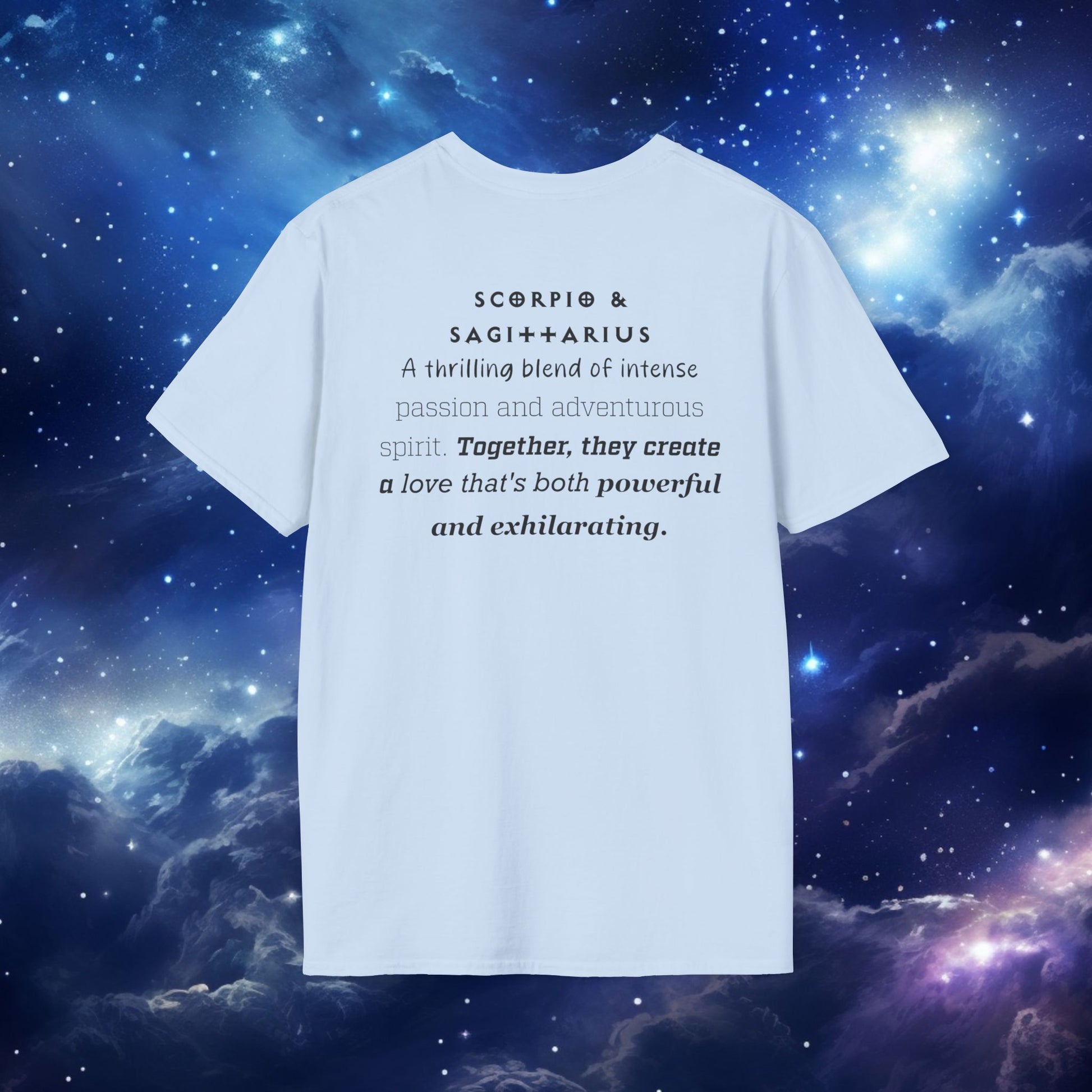 Astrology Zodiac T-Shirt featuring Scorpio and Sagittarius symbols with a love description on the back. This softstyle T-Shirt gives off a mystical vibe and is perfect for astrology enthusiasts. Ideal for those who celebrate birthdays under the Scorpio or Sagittarius signs. Great for casual wear or as a unique gift for astrology lovers.