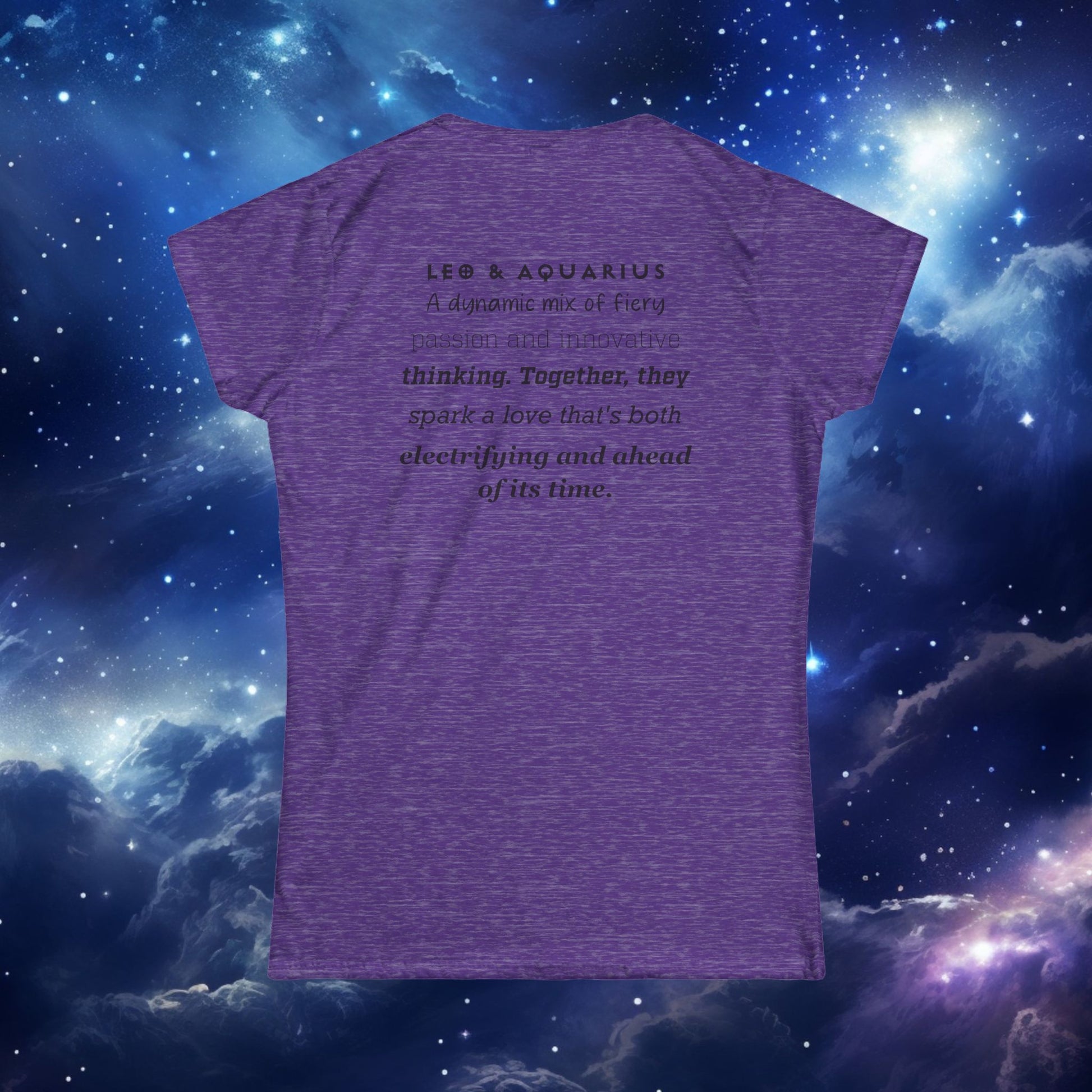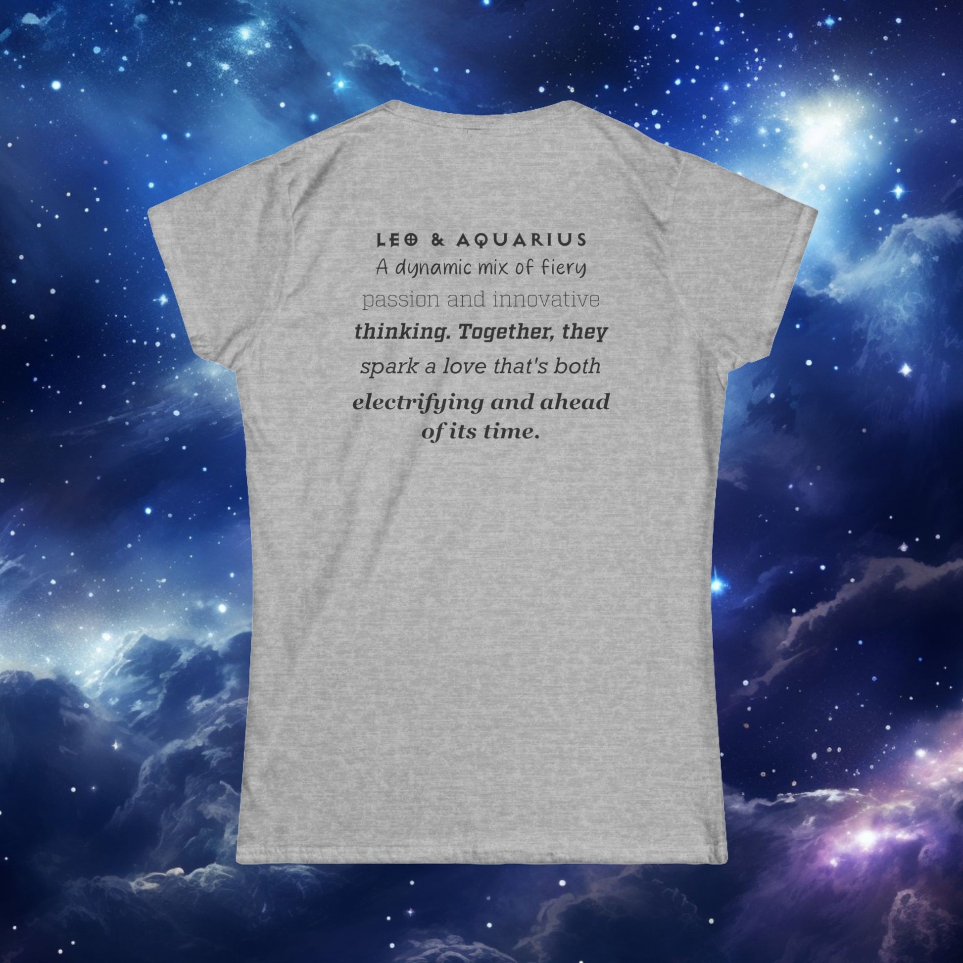 Astrology Zodiac T-Shirt featuring Aquarius and Leo symbols with a love description on the back. This softstyle T-Shirt gives off a mystical vibe and is perfect for astrology enthusiasts. Ideal for those who celebrate birthdays under the Aquarius or Leo signs. Great for casual wear or as a unique gift for astrology lovers.