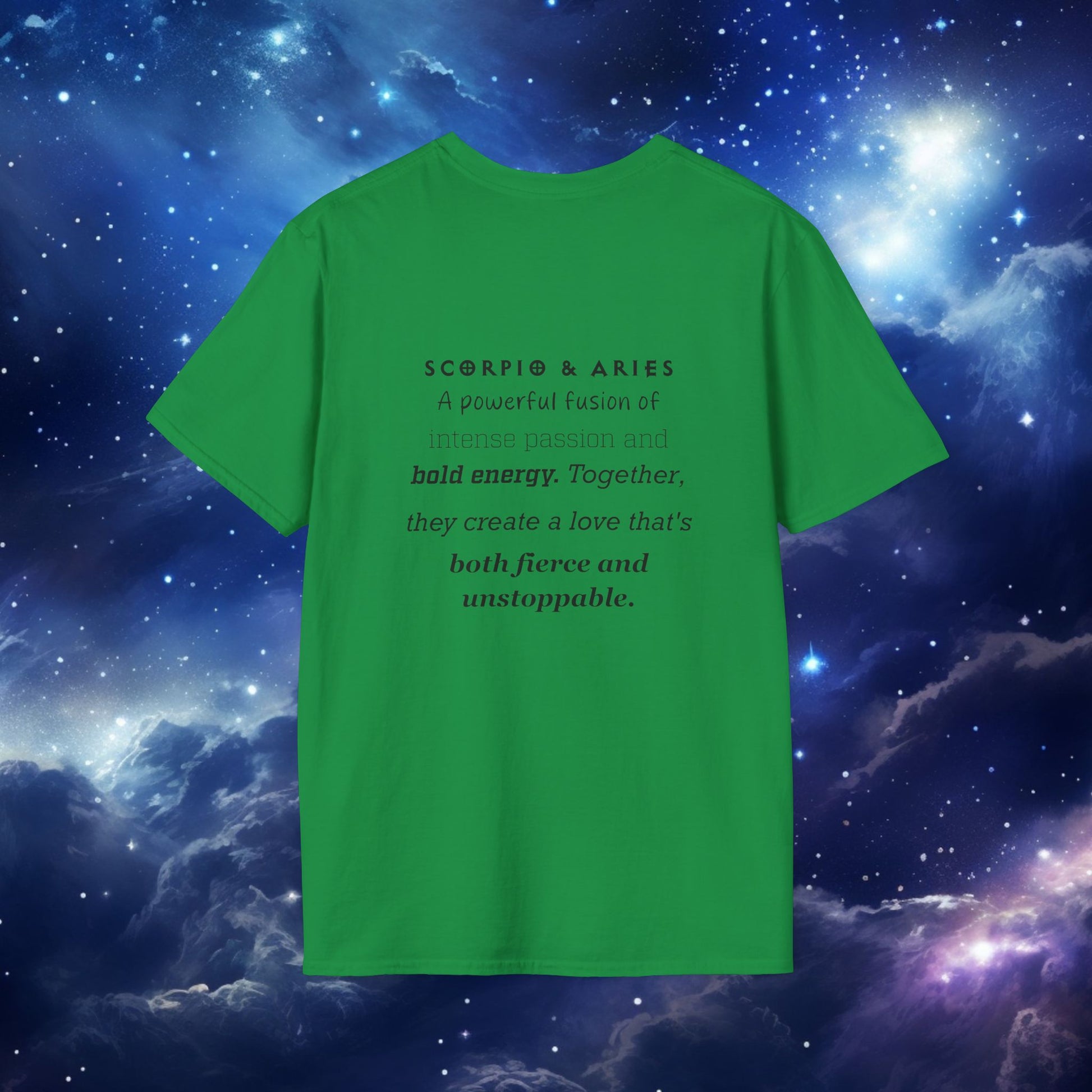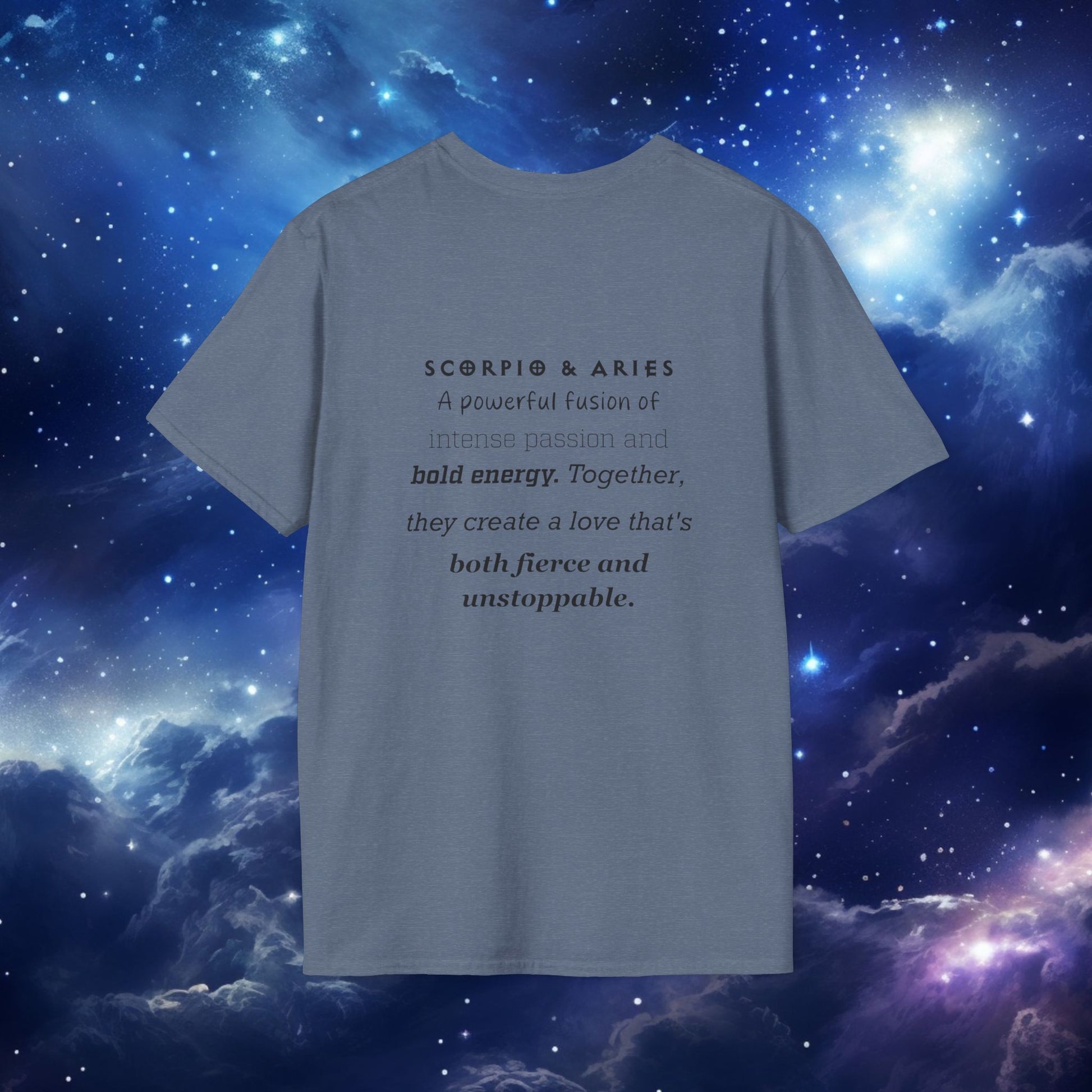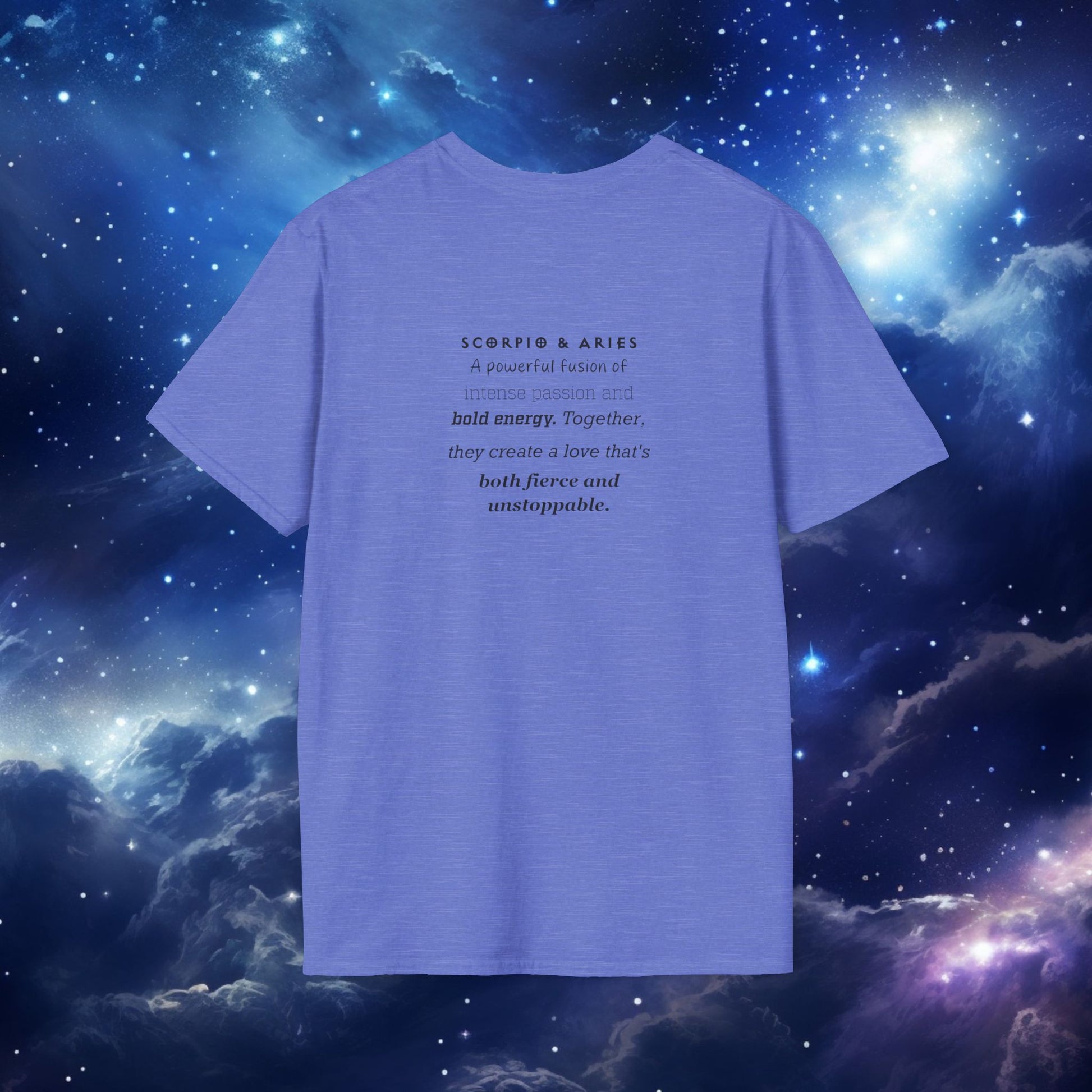 A unisex softstyle T-shirt featuring a design of Zodiac Paring Scorpio and Aries Astrology with a love description on the back. This T-shirt is perfect for astrology enthusiasts and those who enjoy unique, personalized fashion. It can be worn casually or dressed up, making it versatile for any occasion. Ideal for gifting during birthdays or Valentine's Day.