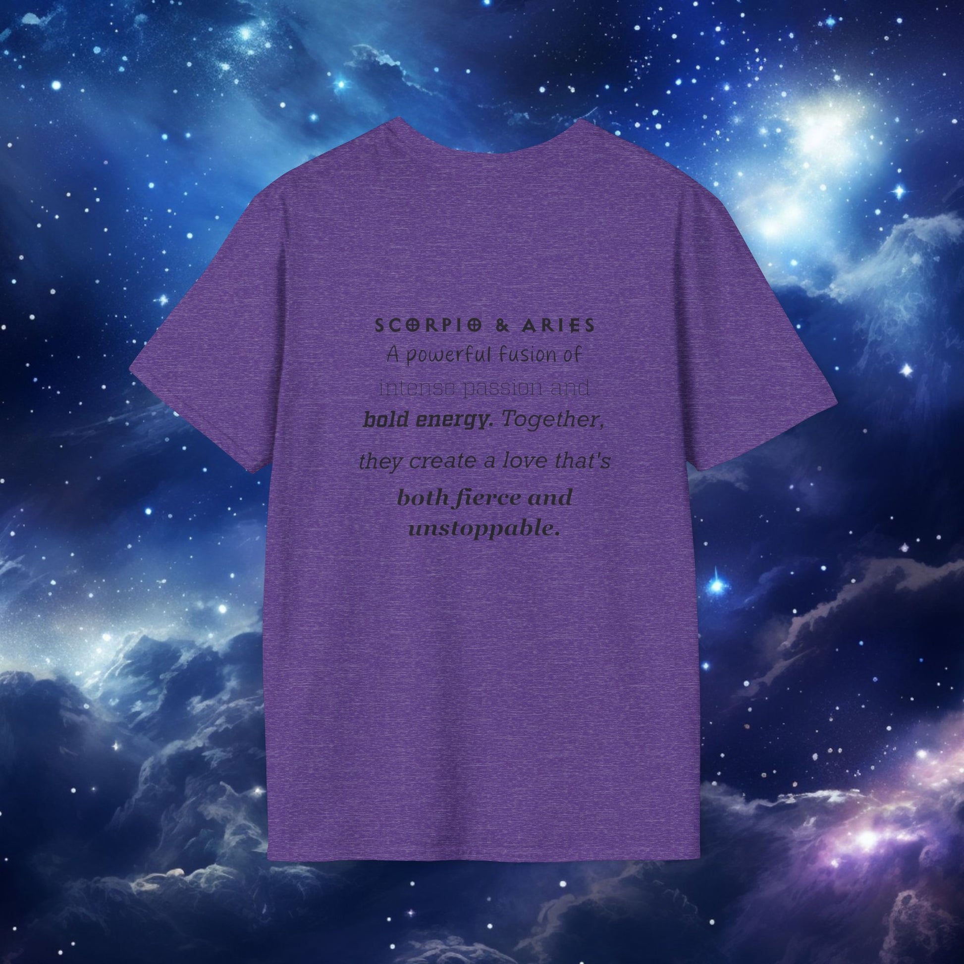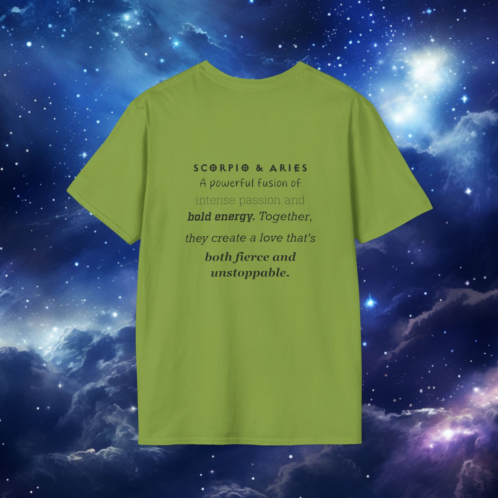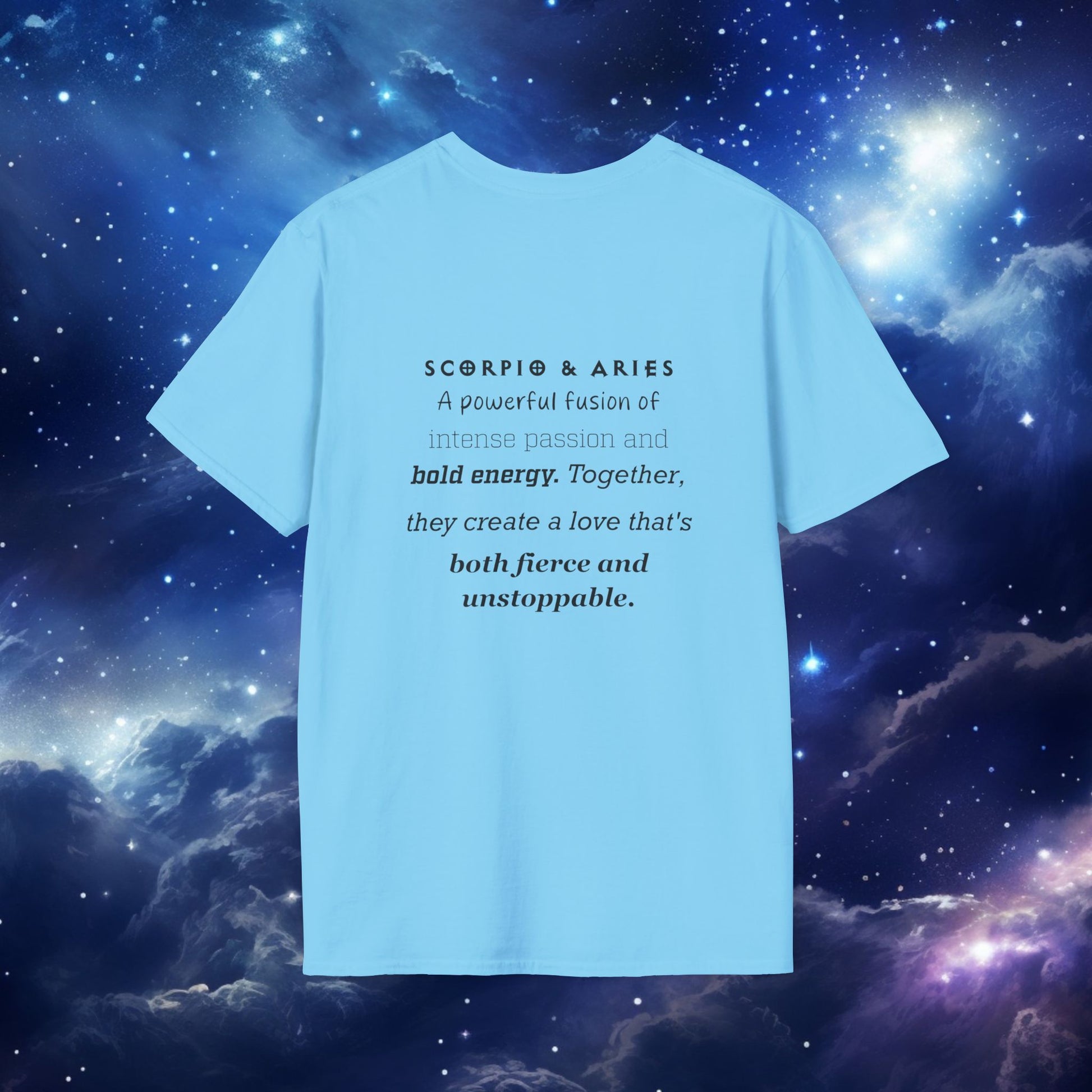 A unisex softstyle T-shirt featuring a design of Zodiac Paring Scorpio and Aries Astrology with a love description on the back. This T-shirt is perfect for astrology enthusiasts and those who enjoy unique, personalized fashion. It can be worn casually or dressed up, making it versatile for any occasion. Ideal for gifting during birthdays or Valentine's Day.
