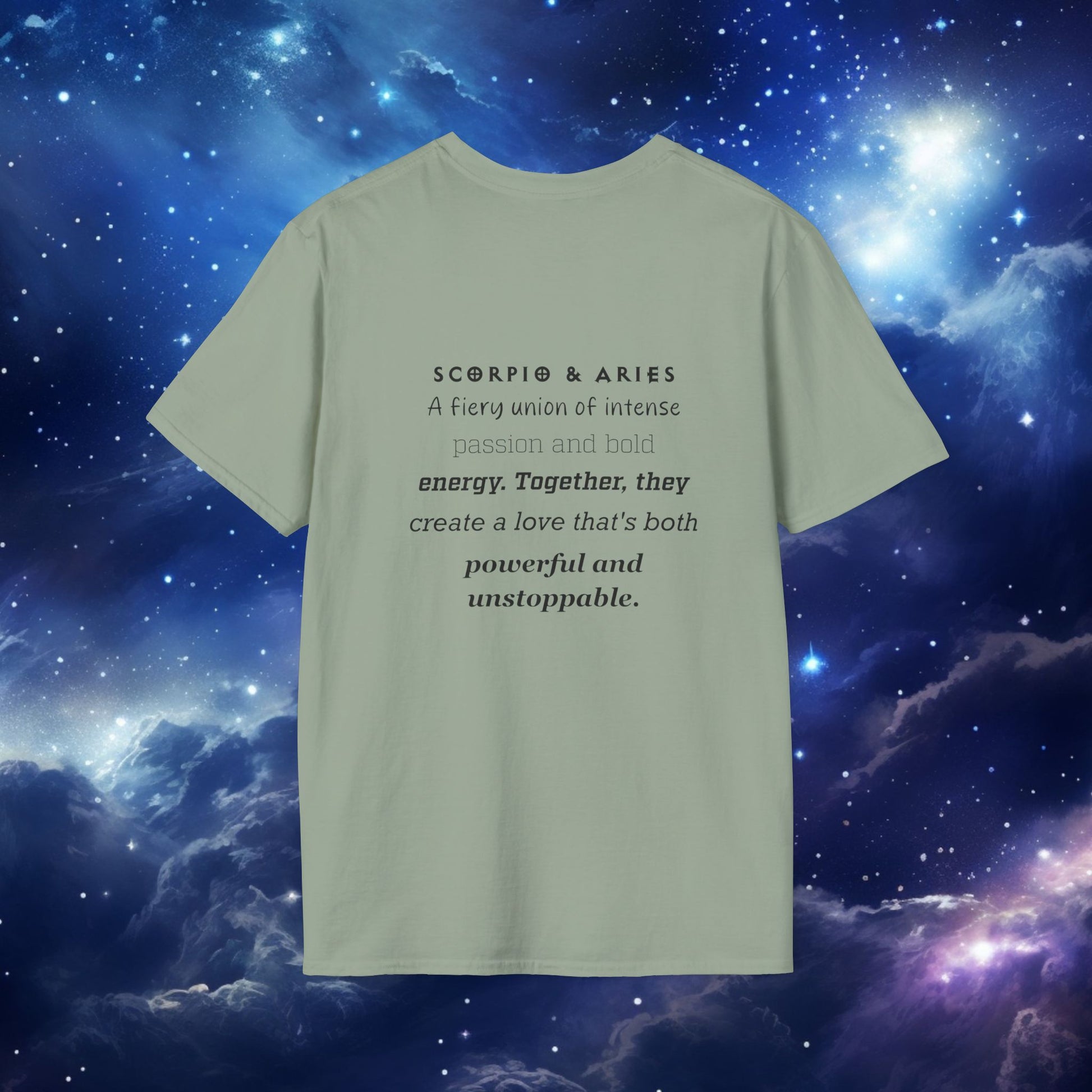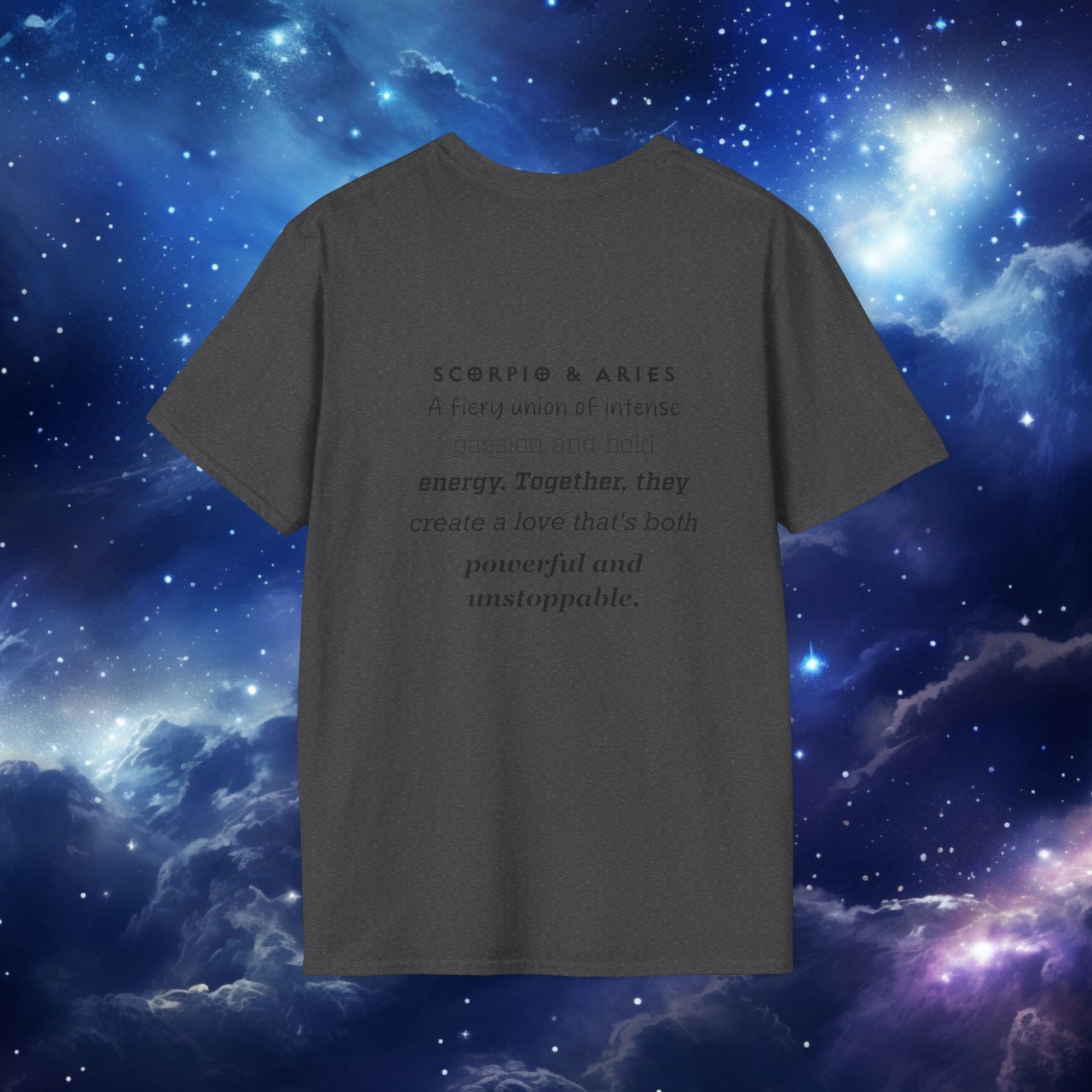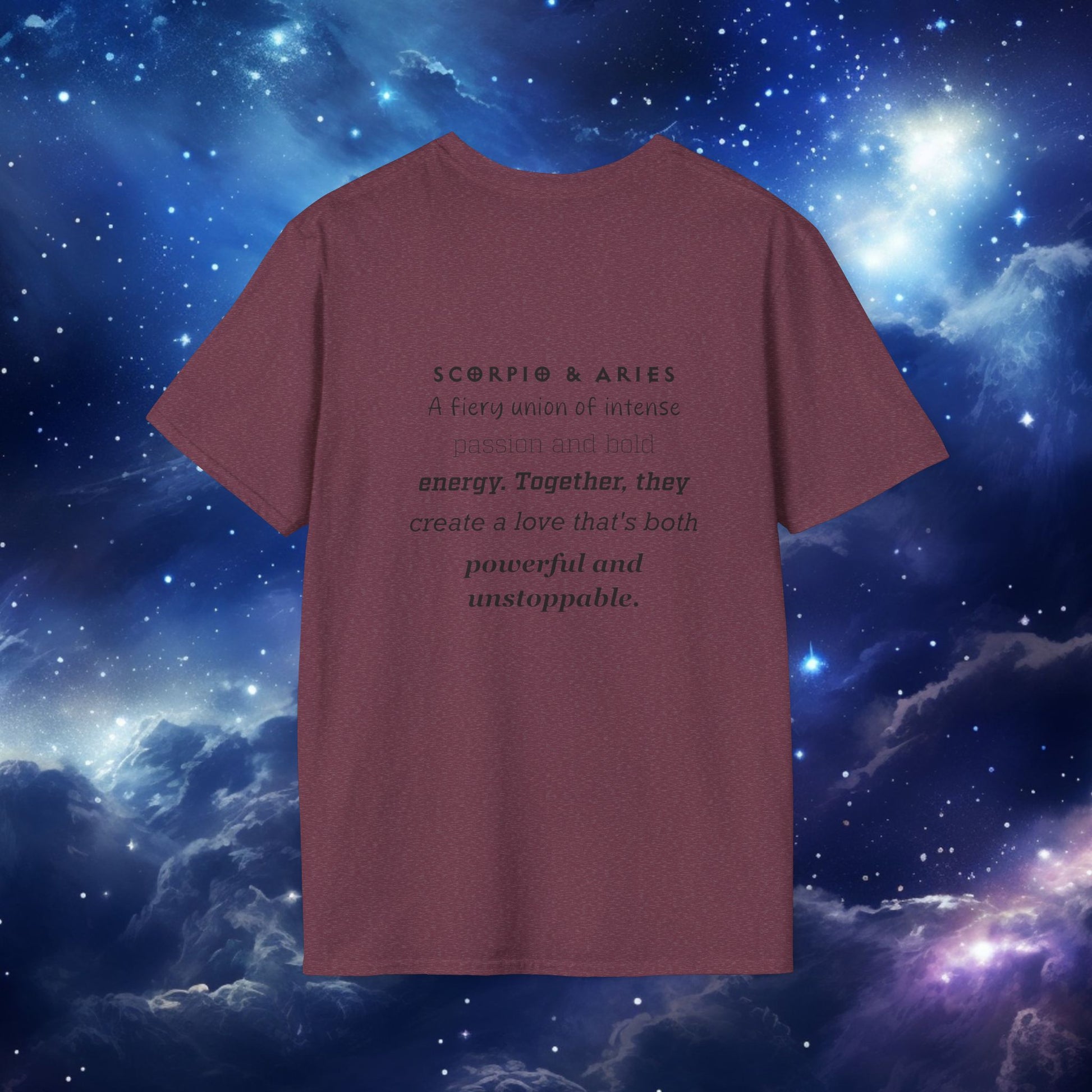 A unisex softstyle T-shirt featuring a design of Zodiac Paring Scorpio and Aries Astrology with a love description on the back. This T-shirt is perfect for astrology enthusiasts and those who enjoy unique, personalized fashion. It can be worn casually or dressed up, making it versatile for any occasion. Ideal for gifting during birthdays or Valentine's Day.